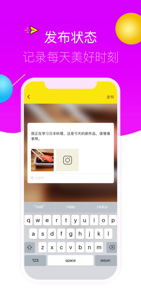 【浏览内容】所有内容都以“我正在”开始,展示自己正在做的事情【发布内容】短按发布按钮拍照发布,长按发布按钮从相册选择照片