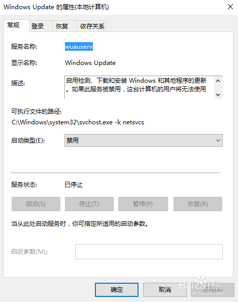 4、找到一个windows update 双击进去 把手动改为禁用 恢复里面的把第一次失败改为无操作 下面的可以改为9999天