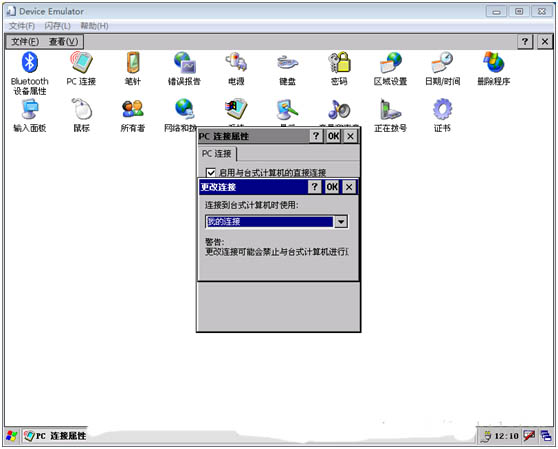 在模拟器中,选择【启动】【设置】【控制面板】,找到【PC连接】,选中【启动与计算机的直接连接】:
