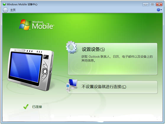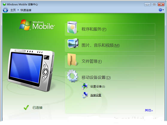 在模拟器连接上电脑后,会启动【Windows Mobile设备中心】,显示“已连接”