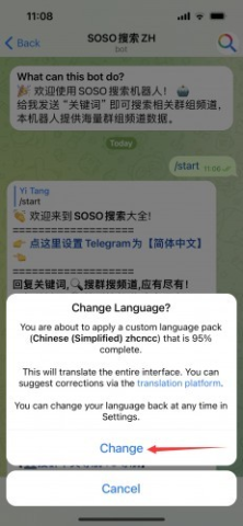 5、最后在底部弹出的页面上,看到提示了吗?即将应用95%的自定义语言包为中文简体,点击“Change”就完成了!一瞬间,界面就换成中文,超级顺畅!
