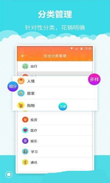 4、场景记账:出行、饮食、人情等场景记账,多种场景让你选择,还可以自己添加;