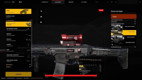 首先是给武器上镜。下图左边primary sight是主镜,secondary sight为侧镜,右边是可用的镜种,High Magnification是高倍,Medium Magnification中倍镜,No Magnification无倍率即一倍镜,Iron Sight是机瞄。