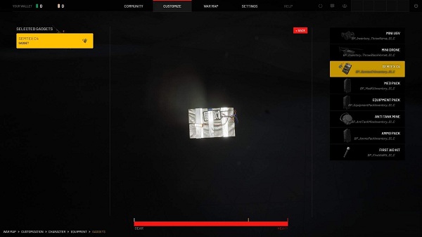 接下来是很重要的装具,右边第一个是四轮侦查小车,可以在上面装C4搞汽车炸弹。第二个是侦查飞行无人机,第三个是C4遥控引爆,第四个是医疗包3键扔地上对着包按F回血,第五个是甲包头盔防弹板打没了可以补,第六个是磁性反坦克雷找大路扔吧秒杀所有载具,第七个是弹药包同扔地上对着按F补弹药,最后一个是急救针3键掏出来鼠标左键给自己回三分之一血,对着队友鼠标右键给队友回血,过一段时间就会刷新。