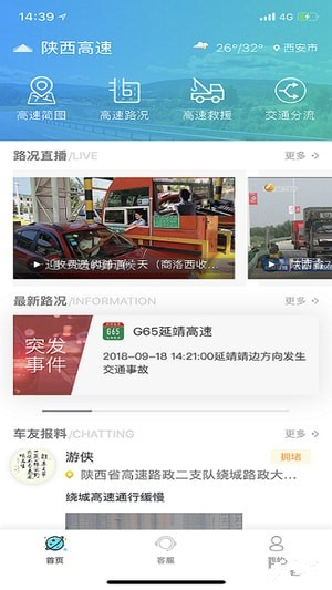 陕西高速app是一款高速公路出行信息服务移动应用,这款陕西高速app是由陕西省高速公路收费中心为公众推出,陕西高速app中整合陕西省高速实时路况、高速救援、在线客服、路况直播、路况报料等高速服务功能,致力于为公众出行提供准确、便捷、个性化的交通信息服务。