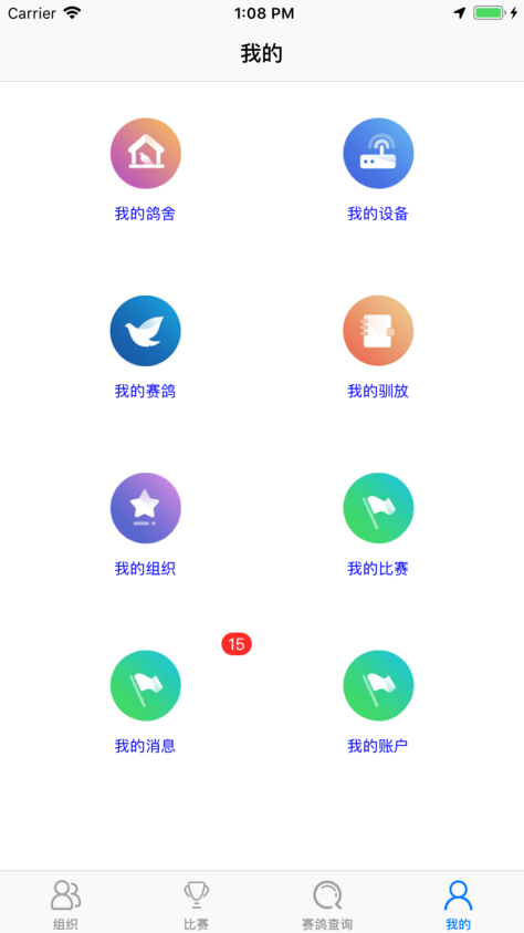 【我的组织】第一时间了解各个赛鸽组织的比赛、公告信息【我的鸽舍】智能管理赛鸽、赛鸽自动驯放,实时获取各赛鸽驯放成绩