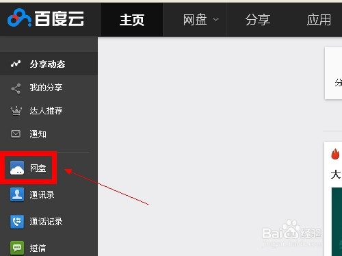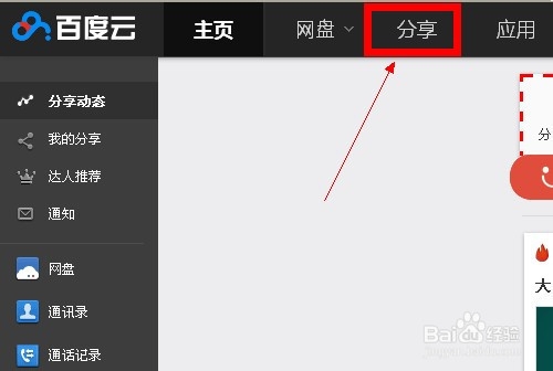 首先来到百度云个人主页,点击上面的“分享”菜单。(如下图)