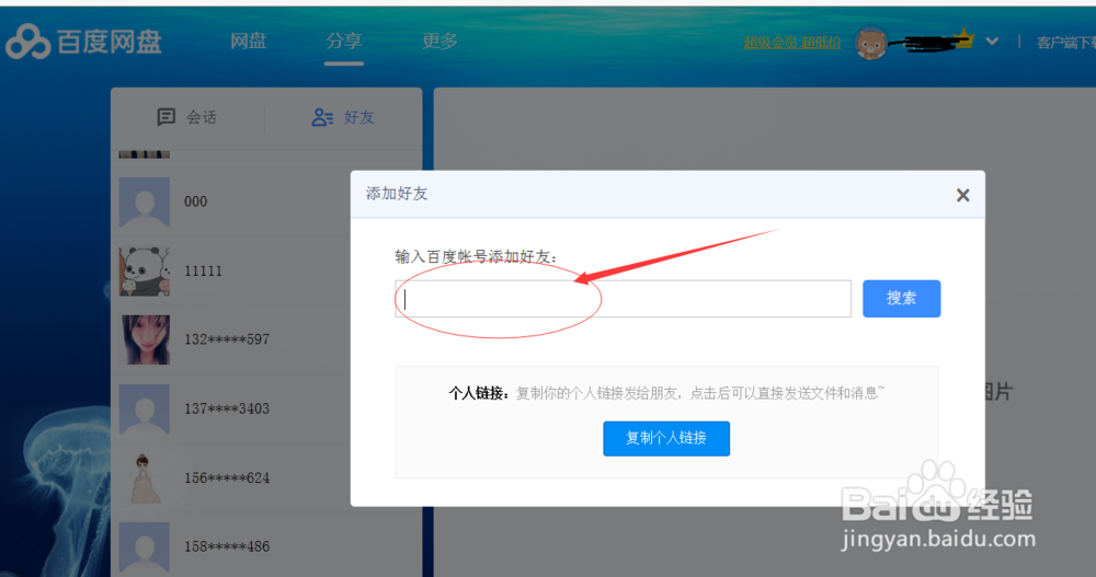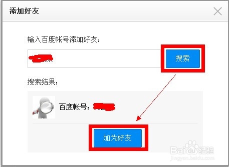 接着输入好友的百度账号,然后点击搜索,在出现的搜索结果中,点击加为好友。(如下图)