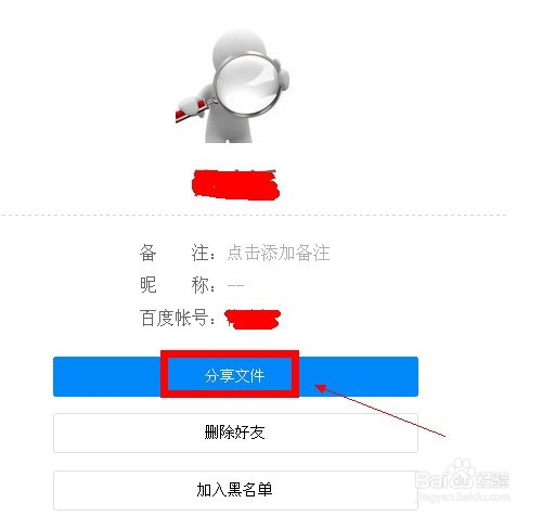 接着在右侧弹出的跟好友相关的功能菜单选项中,点击”分享文件“。(如下图)