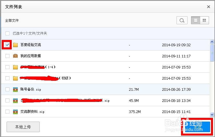 在百度云盘的文件列表,找到自己需要分享的文件,然后勾上,点击发送就可以了。(如下图)
