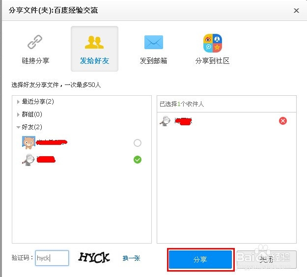 最后选择需要分享文件的具体好友,接着输入验证码,然后直接点击分享就可以了。(如下图)