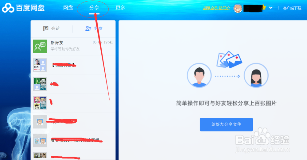 我们在百度云盘的首页,可以看到有一个分享按钮,我们点击分享按钮。进入相关的界面。