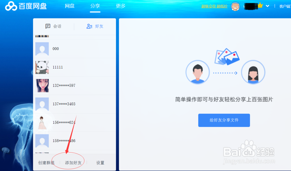如果百度云盘已经有很多好友,那么也可以使用比较便捷的方式跟好友分享文件,首先在百度云盘个人主页,直接点击网盘,进入文件列表页。(如下图)