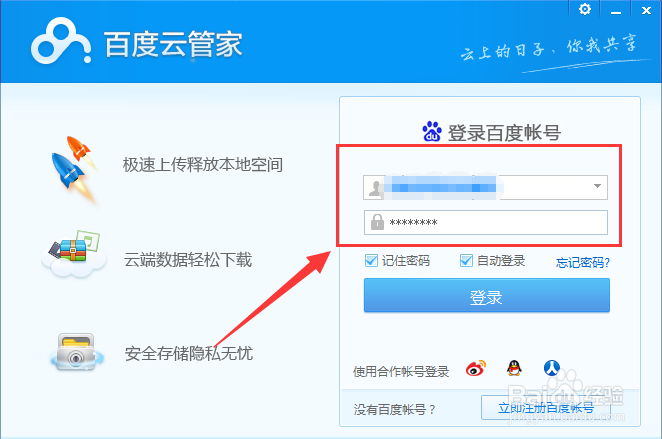 打开【百度云管家】后,输入百度云账号和密码进行登录。