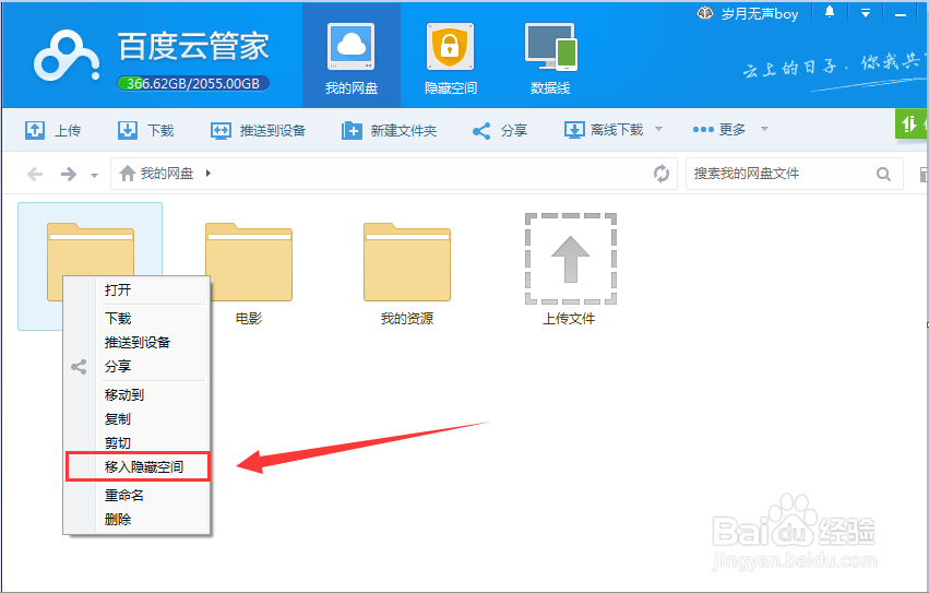 再回到网盘,右键单击需要隐藏的文件或者文件夹,选择【移动到隐藏空间】即可。