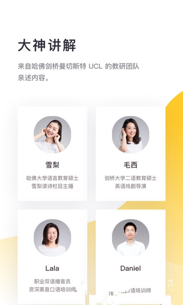 来自哈佛剑桥曼切斯特UCL的教研团队花费70多小时,只为打磨出每天15分钟的音频讲解。大神亲诉讲解内容,深挖知识点,科普外国文化,多维度拓展。单词、 语法、句型、结构、技巧等高频输入,让你听说读写全面提。