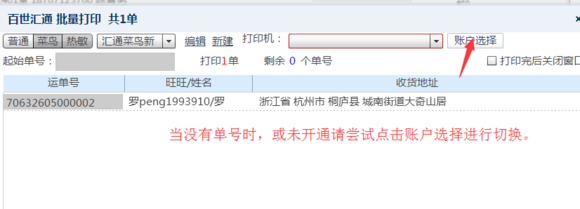 注意事项:多店铺的卖家开通一个菜鸟账号就可以了。同组关联灵通,切换一个菜鸟账号就可以实现共用,见上图。目前都推荐模板XX菜鸟新,都是100X180的纸。