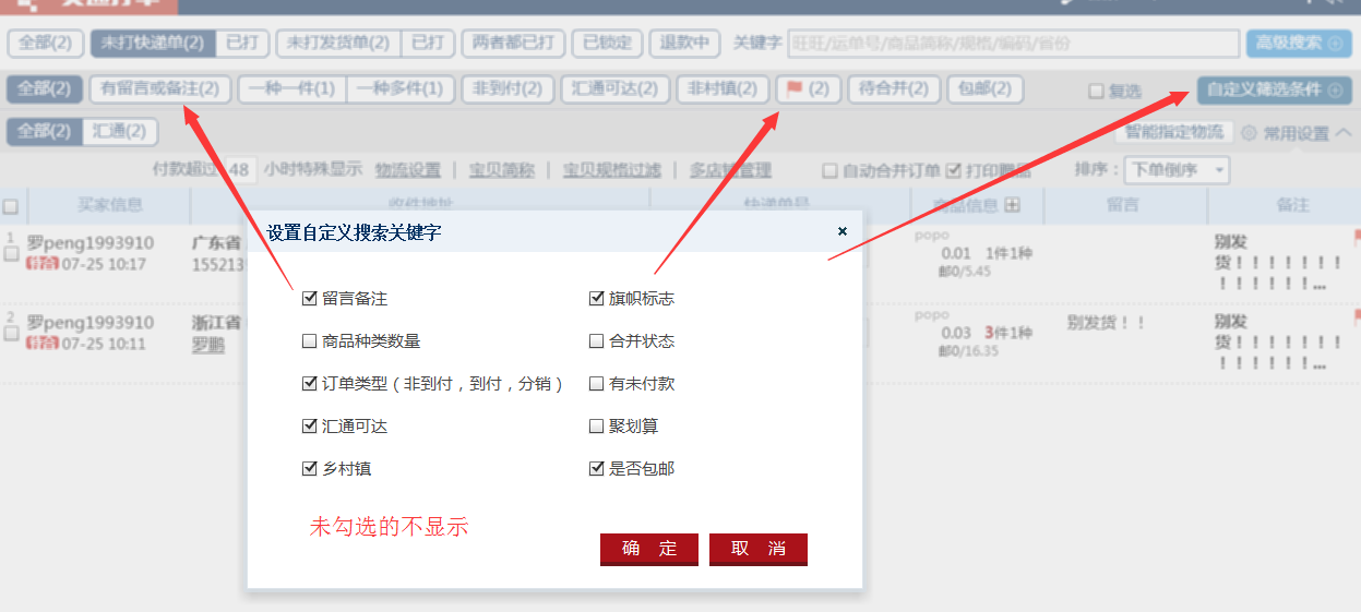 技巧2. 通过标旗、留言备注等条件筛选订单