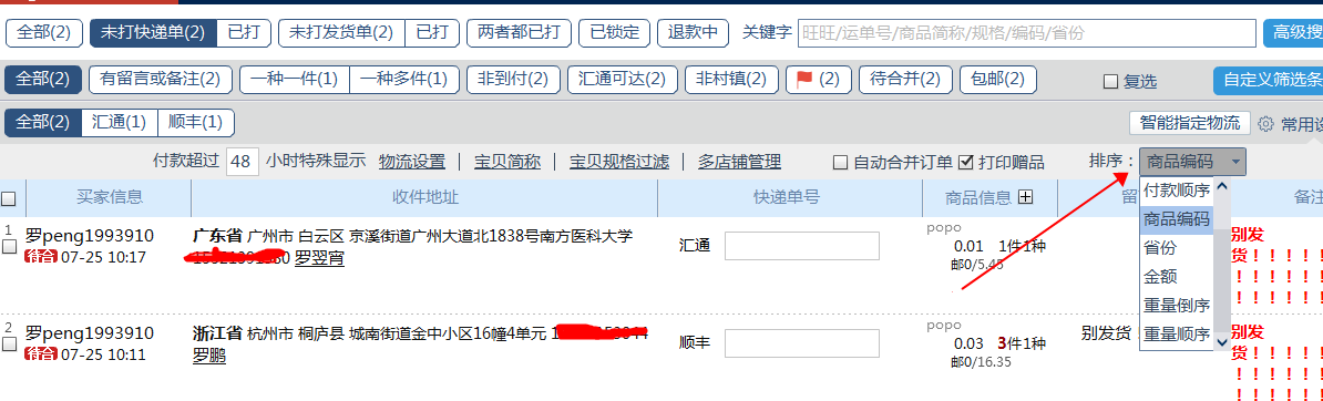技巧3. 根据付款时间,商家编码,省份等排序订单