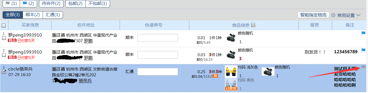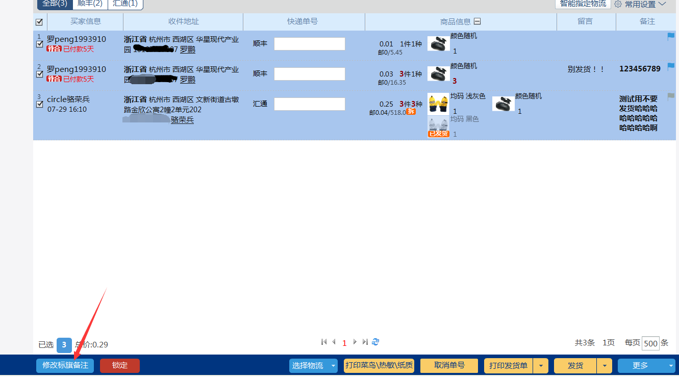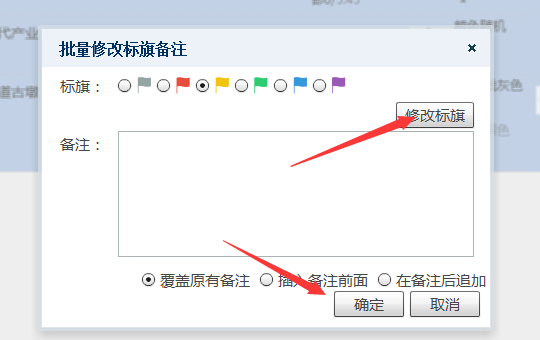 操作方法:选中需要修改备注的订单,点击修改标旗备注