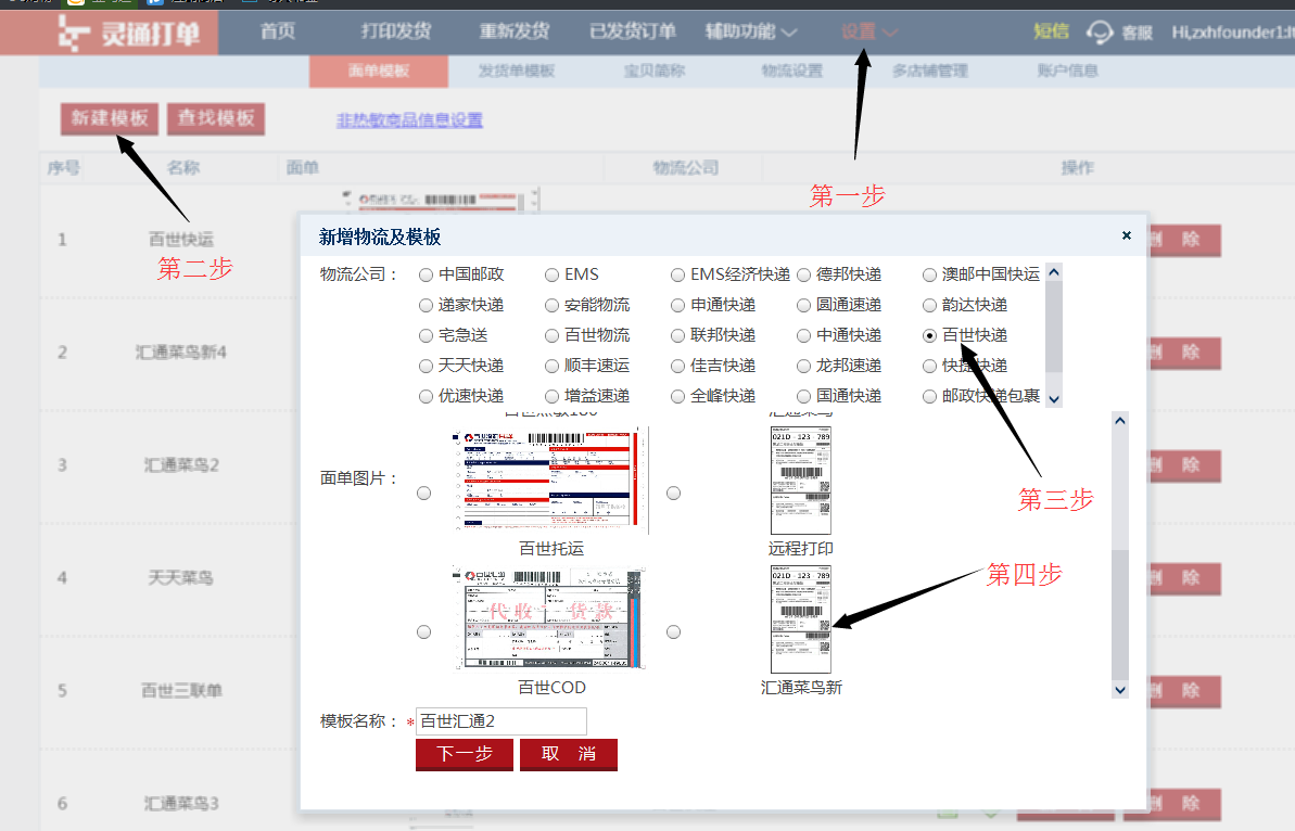 第二步:进入灵通后先到设置页面新建快递面单模板(淘宝用户请使用菜鸟新模板)