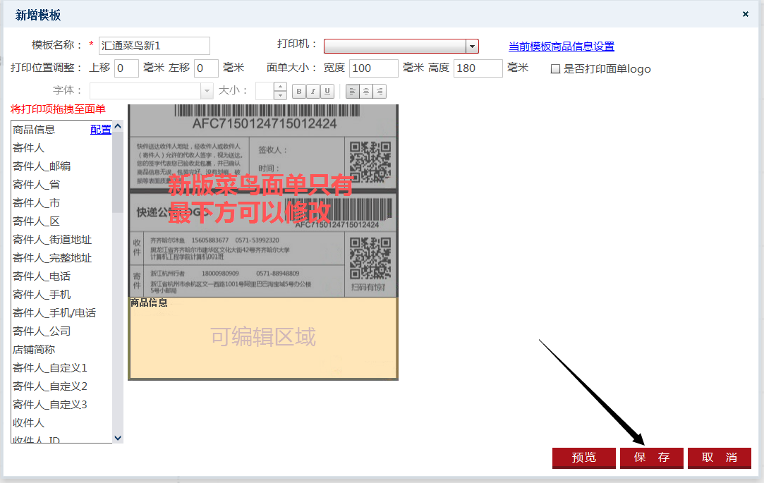可打印各种快递单据,银行收据等。所见即所得的调整模板,双击空白处即可增加新的信息项,双击信息项即可修改信息项内容。