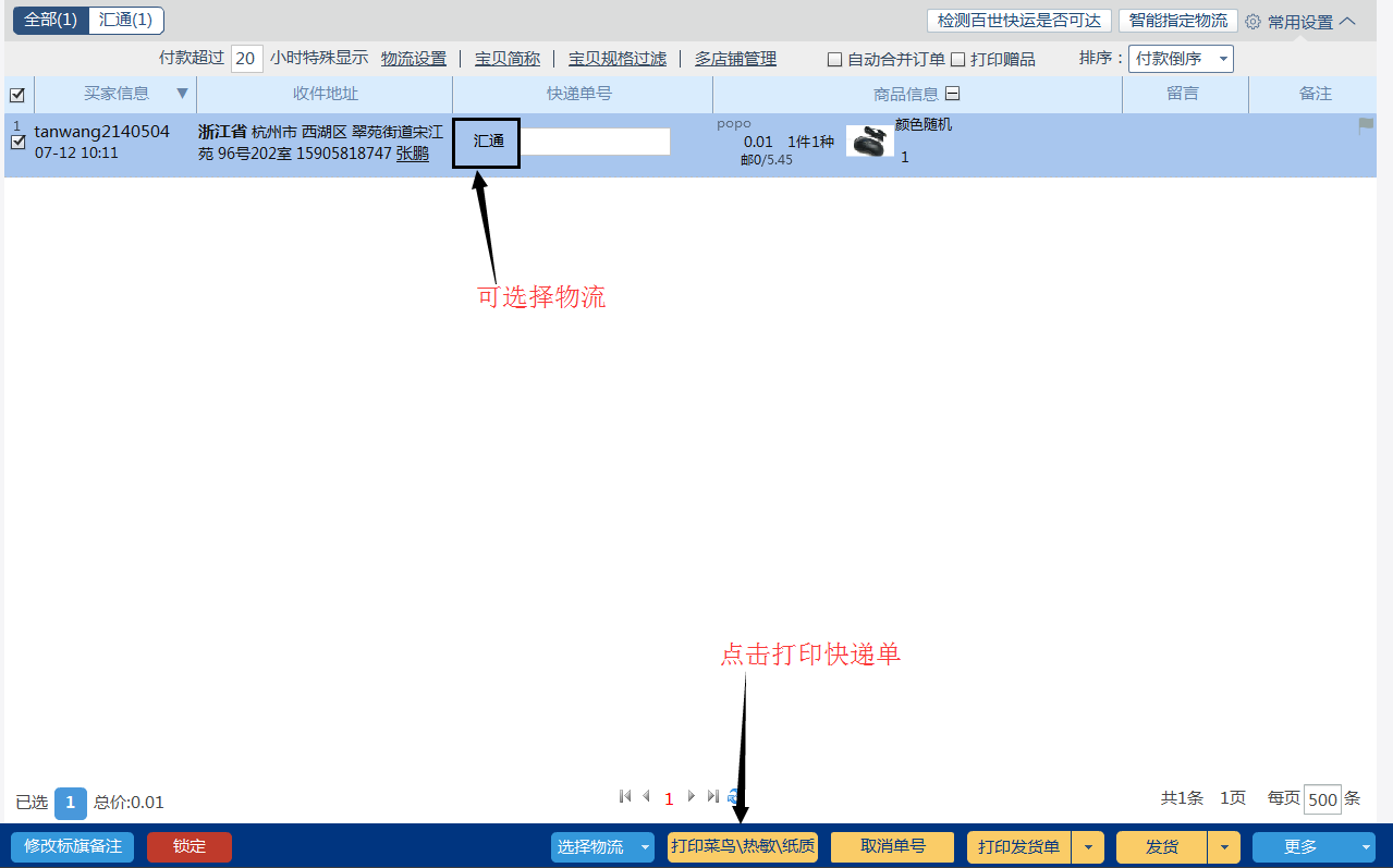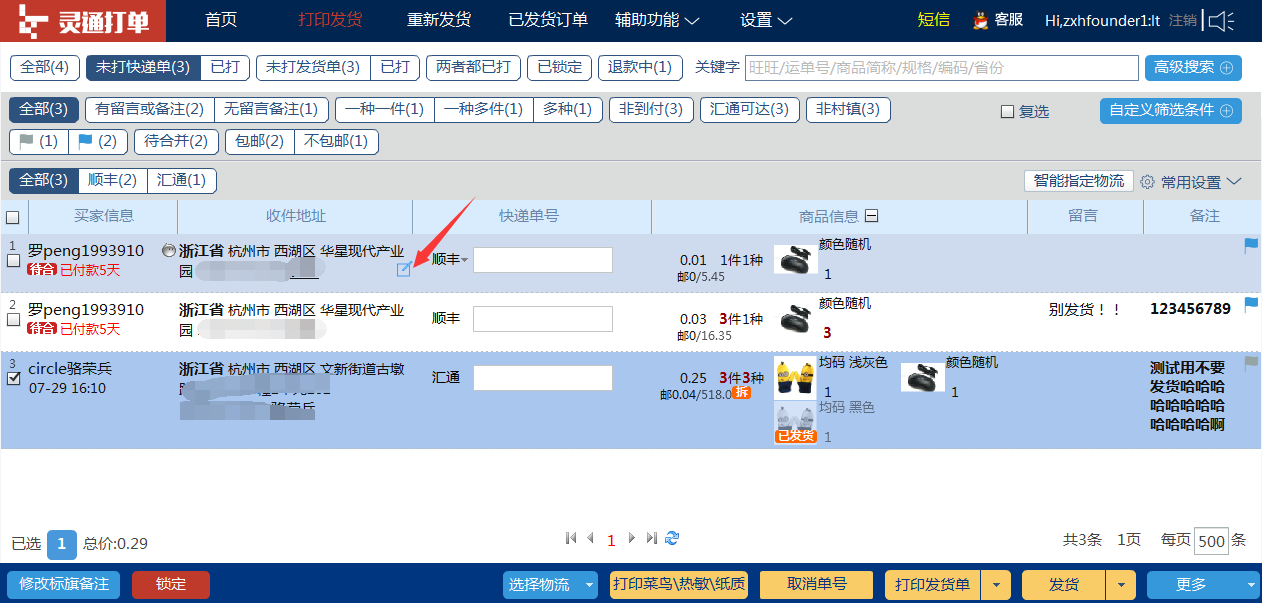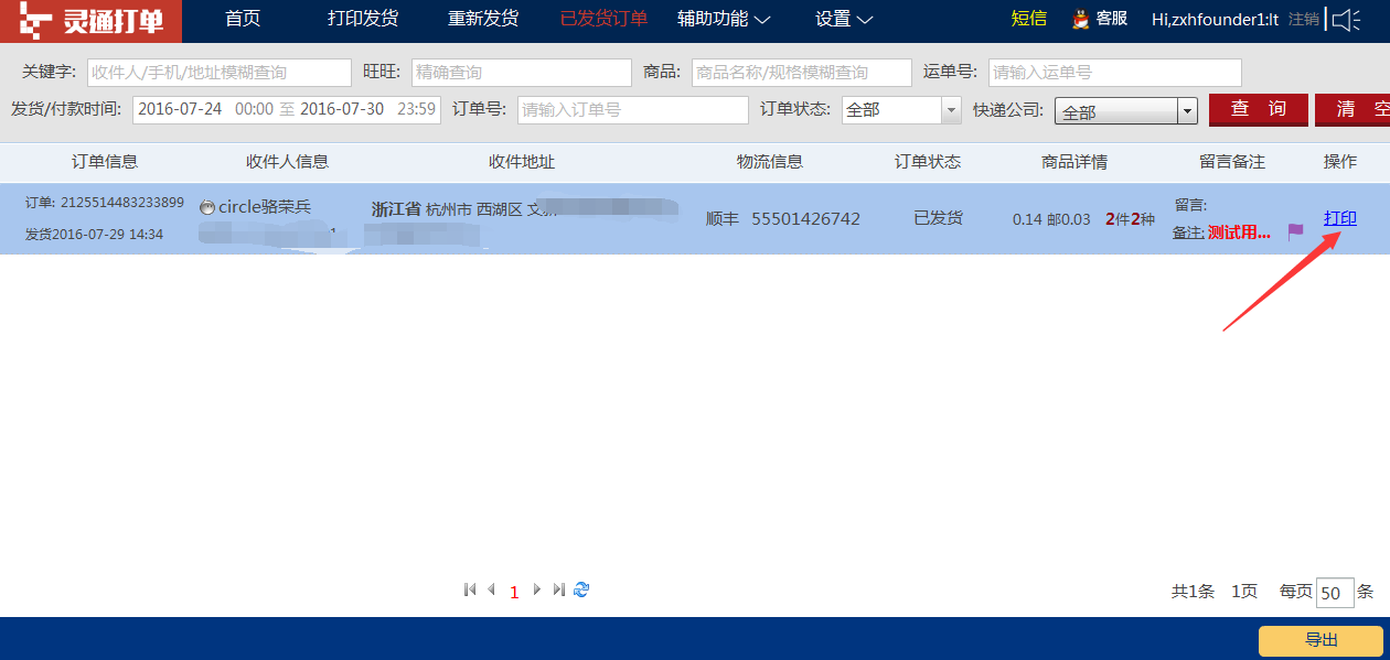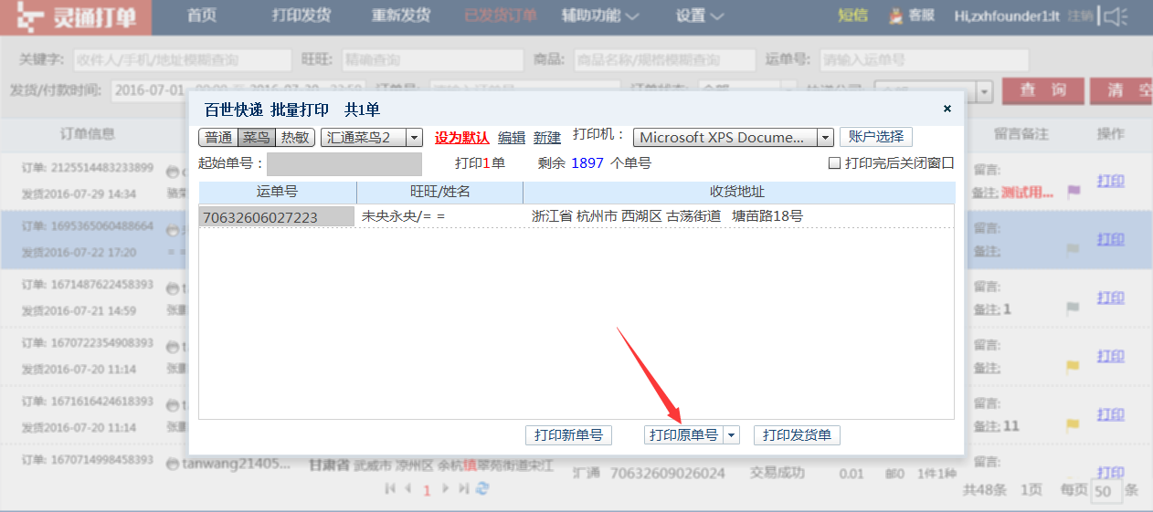 已发货订单页面下选择想要修改地址打印原单号的订单,点击打印按钮