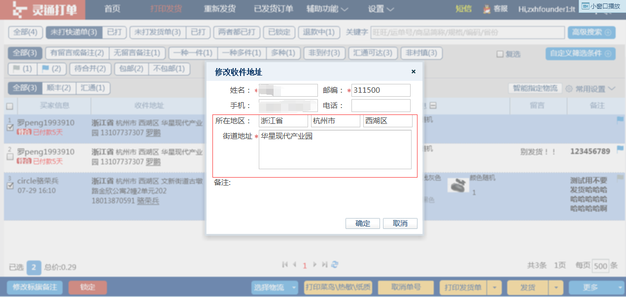 打印发货界面点击收件地址旁的编辑按钮,如图所示: