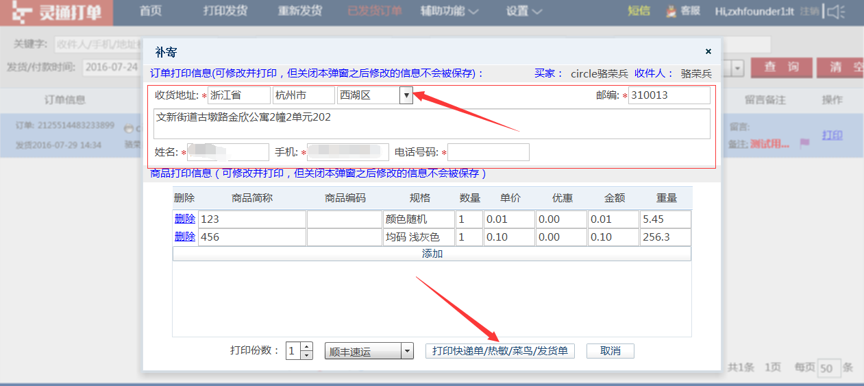 收件人信息修改完成后点击打印快递单按钮,进入批量打印页面,点击打印原单号进行打印即可
