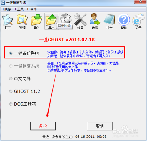但要注意:“备份向导”做的备份只能用“恢复向导”恢复,不能用“一键恢复系统”恢复。