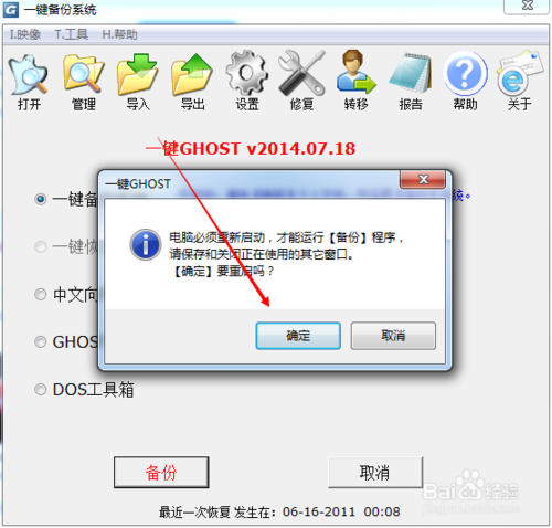 点击系统备份后,系统提示必须立即重启才能运行备份程序,点击确定,如下图所示。