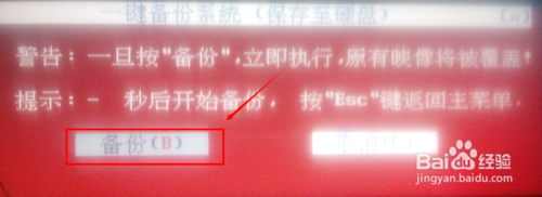 点击重启后,启动一键ghost硬盘版来备份系统,此时出现一键备份系统的提示,我们点击备份,如下图所示。