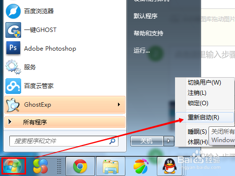 然后点击Win7电脑开始菜单,选择重新启动计算机,开始恢复系统。如下图所示。