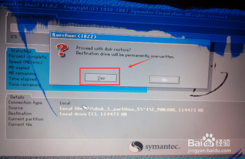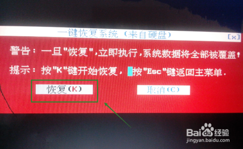 提示是否进行系统一键恢复,点击确定,如下图所示。