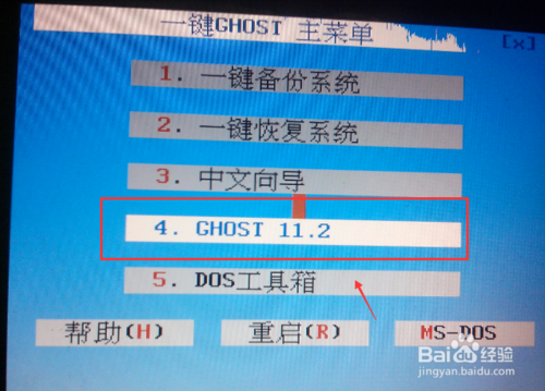 当一键不能自动恢复系统时,就可以采用手动恢复系统了,选择第四选项,如下图所示。