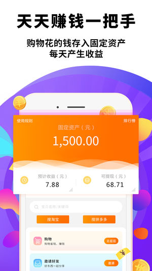 1、一网打尽购物优惠券,网购省钱一把手。2、通过淘天购网购的钱变成固定资产,每天产生收益,天天赚钱一把手。
