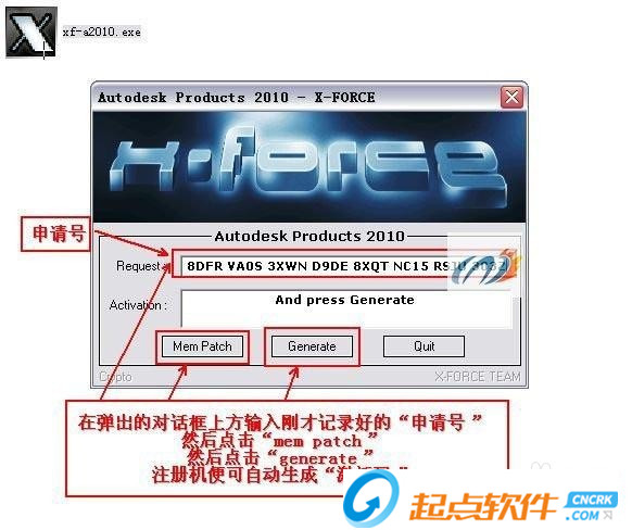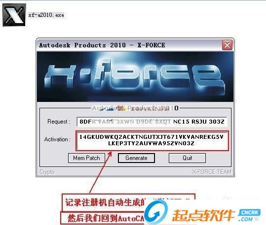 4,在注册机“申请码”下框中 粘贴刚才记下的申请码,先点击注册机"Mem Patch",再点击“Generate”按钮。这时将会在“激活码”下框中得出激活码,用复制 激活 码并返回auocad2010激活界面。