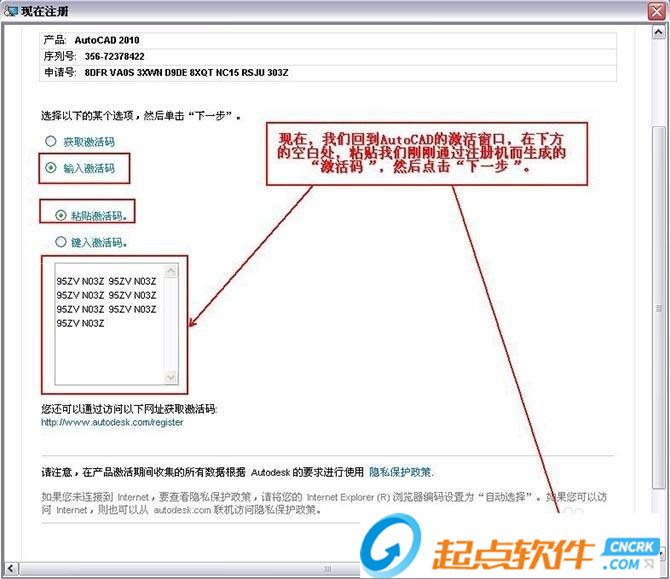 5、在auocad2010激活界面选择“输入激活码”“粘贴激活码”,用粘贴刚才记下的激活码。点击“下一步”,激活成功。