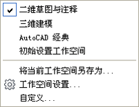 系统为用户提供了“二维草图与注释”、“AutoCAD经典”和“三维建模”三种工作空间。用户可以通过单击如图1-1所示的按钮,在弹出如图1-2所示的菜单中切换工作空间。
