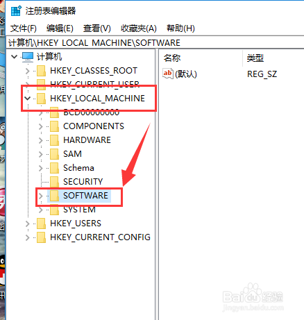 然后我们在主根目录点击-HKEY LOCAL MACHINE文件夹,并在该文件里找到 software文件夹并打开,如下图所示,有的software是大写的,所以注意一下即可。