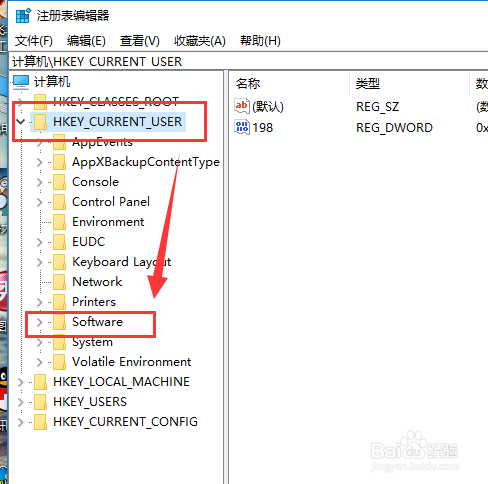 进入到了--注册表编辑器-页面以后,然后我们找到HKEY CURRENT USER文件夹,并在该文件里面找到 software文件夹,如下图所示。