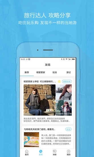 【内容创作】平台贴心的为大家提供了明星管家、玩法、游记三大内容创作平台。你可以尽情地挥洒你的笔墨,把你的旅行心得与志趣相投的朋友一起分享、交流。