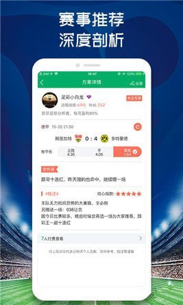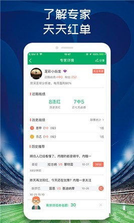 【赛事推荐】明星、草根大神汇集地,与大神一起红单满盈!甚至还有“不中包退”功能,对用户我们是负责的!【赛事资讯】球队情况、球员伤病实时掌握,我们对球队的了解只差一篇资讯。