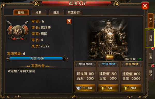 军团科技殿从军团创建开始就自动产生,通过军团全体成员进行军团建设,来提升科技殿的等级。