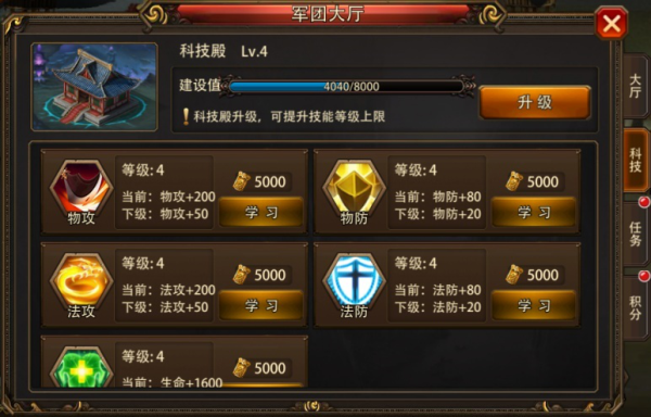 军团科技可以学习的属性有:物理攻击、法术攻击、法术防御、物理防御、生命等等。