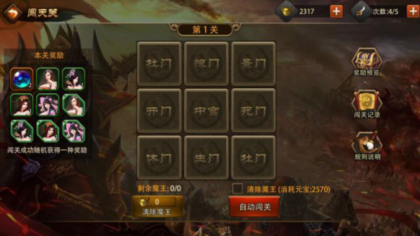3.每通过1关,下关会增加1个魔王,可以使用元宝清除魔王,增加通关成功概率