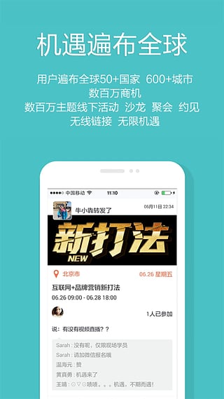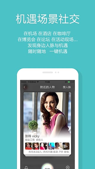 为了有效沉淀、升华商务社交中的信任与关系,机遇产品主打从线上到线下的o2o战略,推出了基于地理位置的机遇发现功能,用户可以发现周边高质量的人脉、活动与资源。
