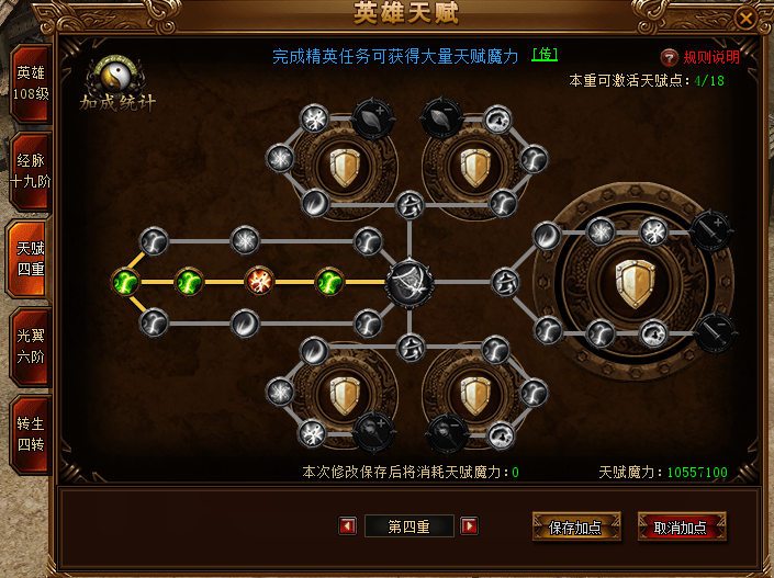 通过主线任务可开启英雄天赋系统。天赋系统是对英雄战斗特色的培养系统,可通过自由加点激活不同的天赋点,不同的天赋点具备不同的属性提升,可根据自己的实际需求选择激活。天赋系统可进阶,达到每阶所需要的天赋点后,可进阶到下一重天赋,以便可激活更高级的天赋点。激活天赋点需要消耗天赋魔力,可通过完成精英任务、击杀精英怪掉落或商城购买天赋魔晶并使用获得。用户点击已经激活的天赋点可进行洗点操作,确定洗点将扣除其激活所需消耗的50%天赋魔力作为洗点费用。