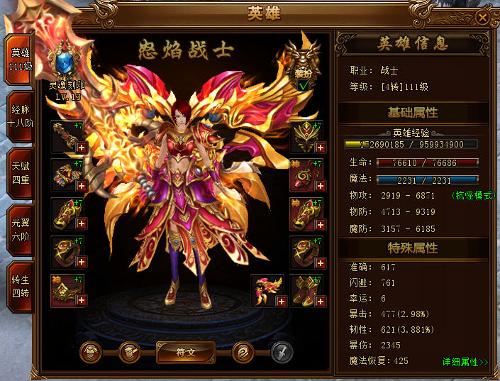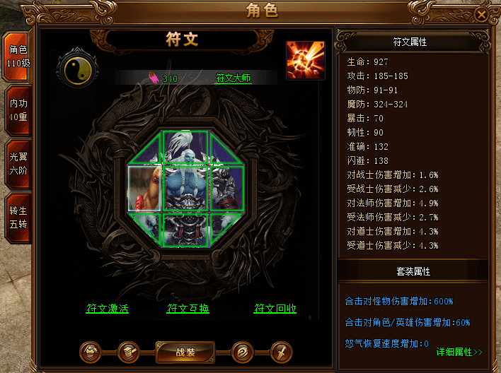 主角系统主角系统展示,包含:角色装备信息、角色信息显示、角色基础属性、角色特殊属性以及详细二级属性等,同时左侧为角色主要养成系统,包含内功系统、光翼系统、转生系统等。下方为角色符文系统以及角色套装激活系统。