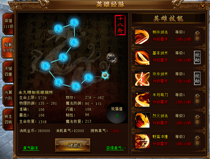 通过激活英雄经脉系统,可激活英雄的技能。并且通过提高经脉等级,可永久增加英雄的基础属性,并可提升英雄技能等级。通过技能开关可控制英雄自动使用的技能顺序。通过参与真气副本、金币兑换以及商城购买真气丹并使用,可获得真气,通过消耗真气可提升英雄的经脉等级。